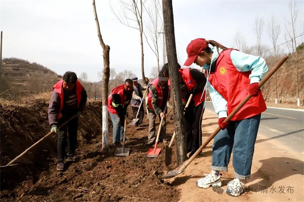 在秦亭镇盘龙村整治路域沿线,原本杂乱的边坡被修整成错落有致的“小节点”。槐树苗迎风挺立、整齐排列,村民们俯身于树下花带松土、平整树盘,让路域环境呈现出勃勃生机。
