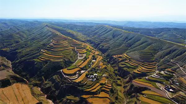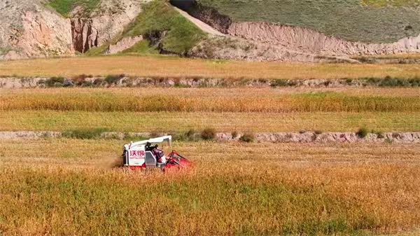 金秋时节的榆中县韦营乡,万亩梯田尽染鎏金,处处洋溢着丰收的欢愉。收割机在田间轰鸣作响,来回穿梭,吞吐着金色的黍浪;满载而归的农用车,一路欢歌驶向烘干基地。高高的烘干塔全力运转,将金灿灿的黍粒通过传送带源源不断地送入粮仓——一幅现代寒旱农业的丰收画卷正徐徐展开。