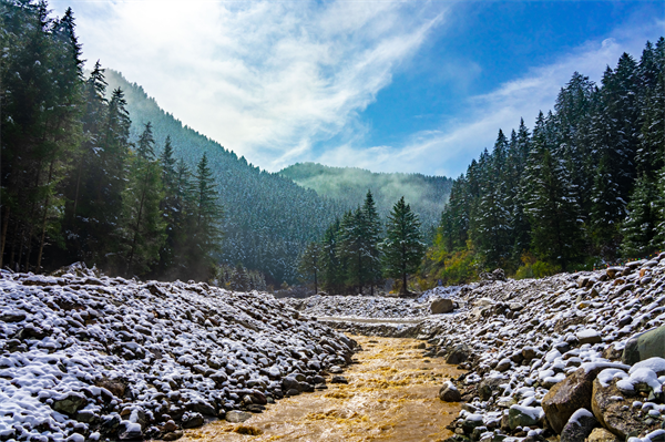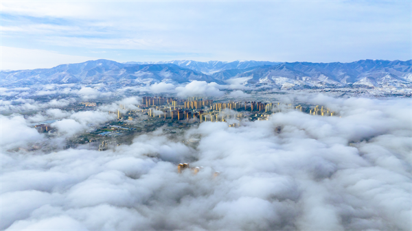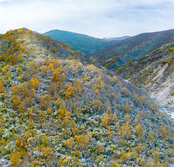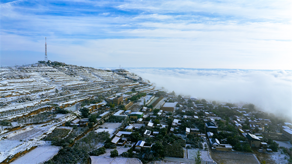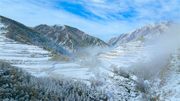 不同于深冬的凛冽,这场雪带着几分温柔,悄然覆盖于层层梯田、山间松枝,在缭绕的雾霭中,勾勒出一幅如梦似幻的边塞诗意画卷。