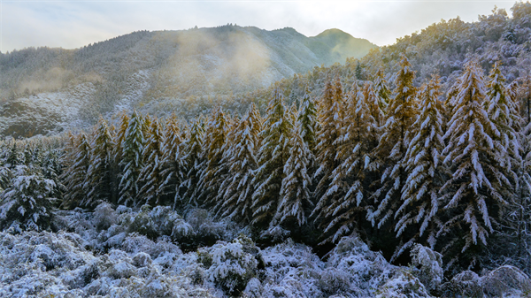 来看一场秋与冬的温柔邂逅。当金秋的余温还漫在田埂上,而这里的第一场雪已悄然赴约,为梯田镶上银边,为松针缀满冰晶。云雾流淌之间,山河如诗,静候您的目光。