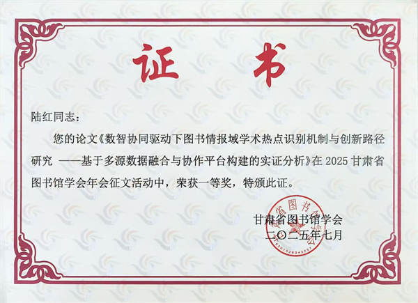 在年会开幕式的颁奖环节,榆中县图书馆的成果单格外厚重。学术研究方面,该馆报送的三篇论文在175篇参赛征文中脱颖而出,分别斩获“2025甘肃省图书馆学会年会征文”一、二、三等奖,每一篇获奖作品都凝聚着馆员们对图书馆高质量发展的思考,也印证了榆中县图书馆在学术积累上的深厚功底。