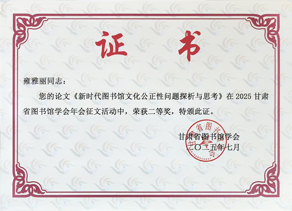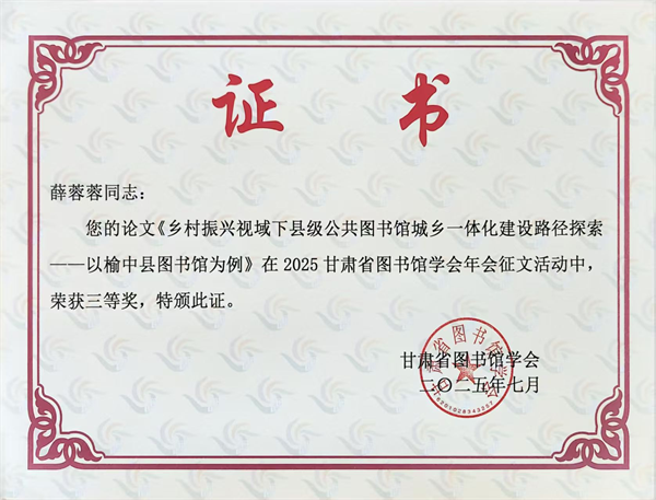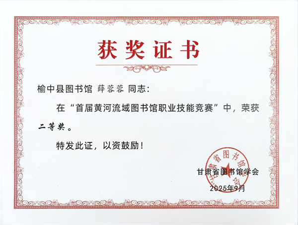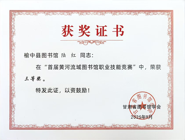 职业技能赛场同样传来捷报。在“首届黄河流域图书馆职业技能竞赛(甘肃赛区)”中,榆中县图书馆的馆员们面对业务实操、资源整合、服务创新等多维度考验,凭借扎实的专业能力和灵活的应变思维,最终拿下二等奖和三等奖,展现了基层图书馆工作者的过硬业务素养。
