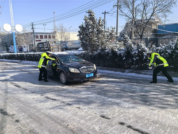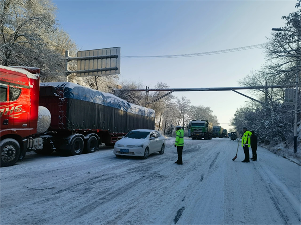在重点路段、路口增设临时警示标志,安排专人值守,指挥车辆有序通行。针对部分积雪、结冰严重暂时不具备安全通行条件的路段,采取临时交通管制措施,并耐心做好解释和分流引导工作。同时,组织民警在执勤过程中,主动为受困车辆、故障车辆提供帮助,救助遇困群众,为群众送去温暖与安心。