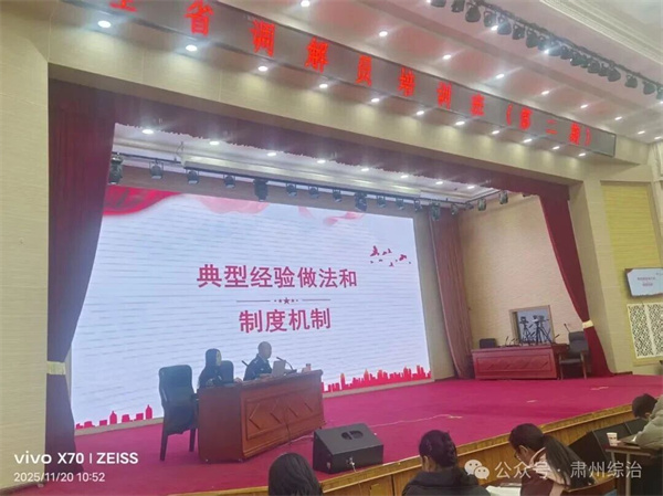 近日,按照省综治中心统一部署,肃州区综治中心首席金牌调解员陈爱民应邀在全省基层调解员培训班上做专题辅导授课,陈爱民同志以鲜活实践案例与专业调解技巧,为来自全省各地的基层调解骨干传经送宝,充分展现了肃州区综治中心规范化建设实战化运行、基层调解队伍建设及矛盾纠纷调解等方面工作成效和风采。