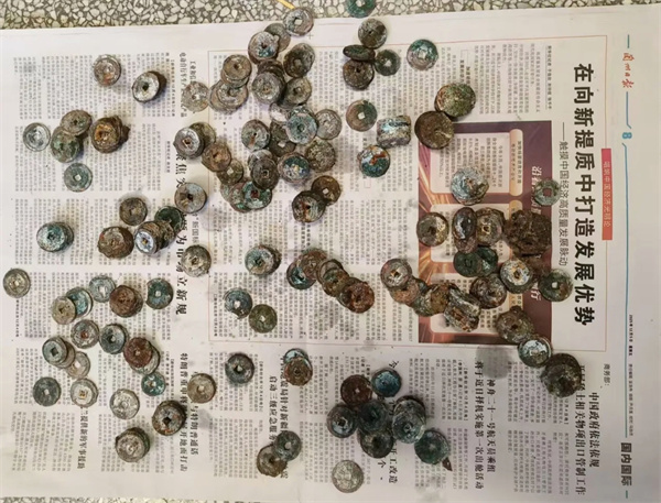 12月7日,榆中县新营镇祁家河村一项目建设工地进行土方作业时,发现一个破损的黑釉罐,并在罐内发现了圆形方孔钱币,参与施工的村民第一时间主动上报榆中县高崖派出所,民警抵达现场后,向施工村民宣传《中华人民共和国文物保护法》,根据规定,“中华人民共和国境内地下、内水和领海中遗存的一切文物,属于国家所有”,同时动员施工人员收集现场散落的古钱币,并安排专人保管直至文物移交,使得这批承载着历史记忆、散发着古朴厚重气息的文物于次日正式移交榆中县博物馆,实现了文物的登记建账与专业保护。