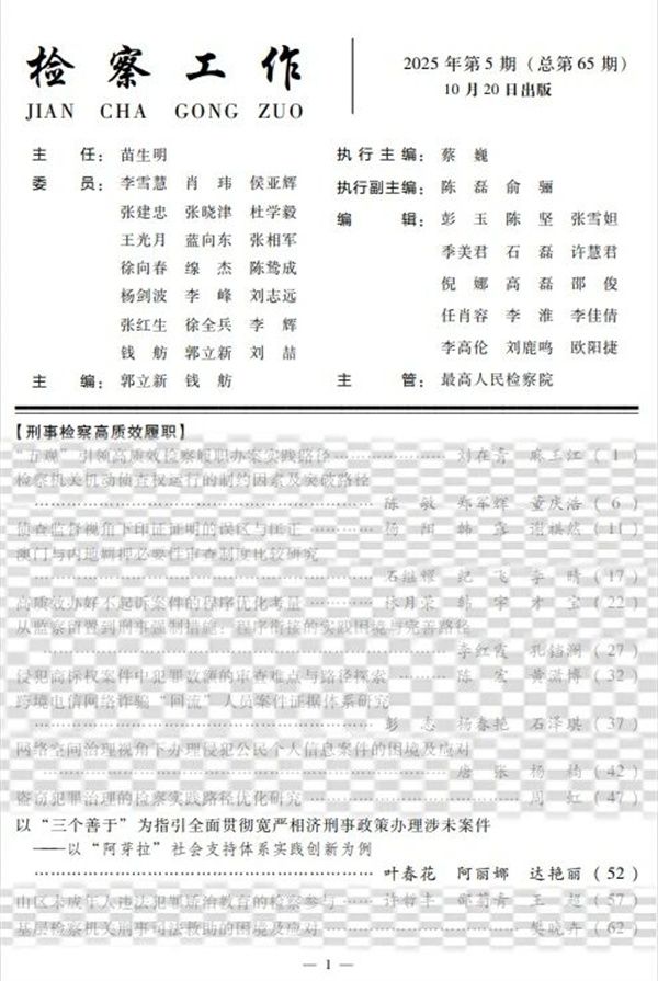 近日,阿克塞县人民检察院党组书记、检察长叶春花,党组成员、副检察长、办公室主任阿丽娜,第一检察部主任达艳丽联合撰写的《以“三个善于”为指引全面贯彻宽严相济刑事政策办理涉未案件——以“阿芽拉”社会支持体系实践创新为例》一文在最高人民检察院主办的检察类知名期刊《检察工作》2025年第5期(总第65期)上刊发。