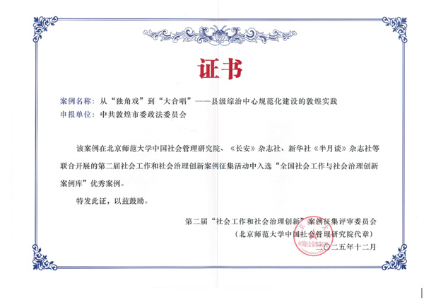 论坛发布了第二届社会工作与社会治理创新案例征集暨北京师范大学“全国社会工作与社会治理创新案例库”入选案例,敦煌市委政法委、市综治中心报送的《从“独角戏”到“大合唱”——县级综治中心规范化建设的敦煌实践》从全国1211个案例中突围而出,成功入选80个优秀案例之列。