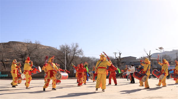 小营子村社火队同样别具风采。金色长龙在队员们娴熟的操控下,时而盘旋跃起,时而低回蜿蜒,灵动非凡;舞狮表演则主打高难度技巧,“踩四门”“狮子上桌”等动作干净利落,腾挪闪转间引得喝彩连连;特色锣鼓表演融合“扣天喜”“三扎手”“鹞子翻身”“三进三出”等十余环套路,以筒子鼓为核心载体,融小红拳之灵动、大红拳之刚劲,形成“拳鼓相合、刚柔并济”的独特风格;秧歌队伍服饰鲜艳、步调整齐,以轻盈活泼的舞步和巧妙多变的队形,扭出了村民们心中满满的获得感与幸福感。一位年轻的返乡务工人员一边擦汗一边感慨:“看了这么多年社火,以前觉得不过是‘老传统’,亲身融入才体会到每个动作都有讲究,一招一式都是故事——这是咱自己的宝贝,不能丢。”