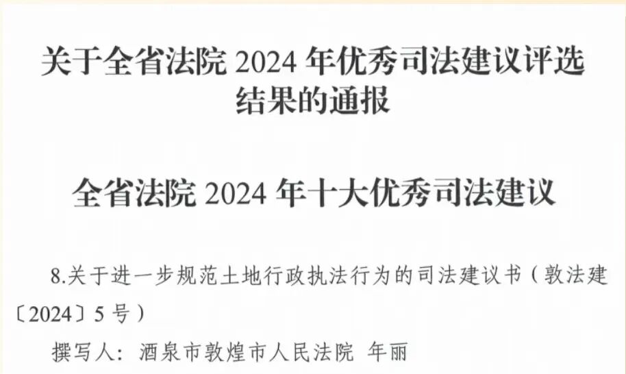 近日,甘肃省高级人民法院印发《关于全省法院2024年优秀司法建议评选结果的通报》,全省各级法院共推荐106篇司法建议参评,其中,敦煌市人民法院上报的1篇司法建议获评全省法院2024年十大优秀司法建议。