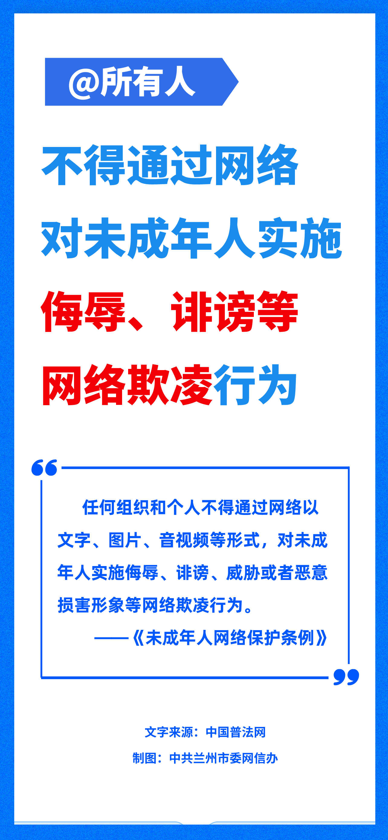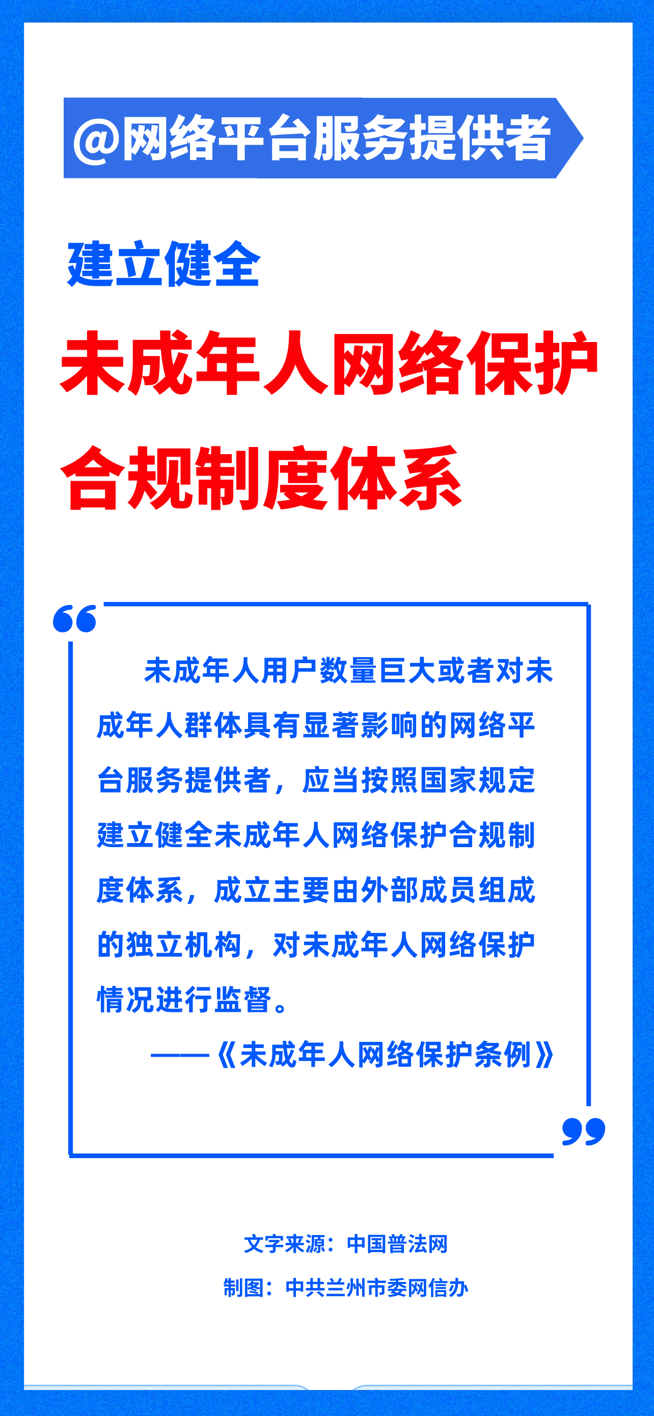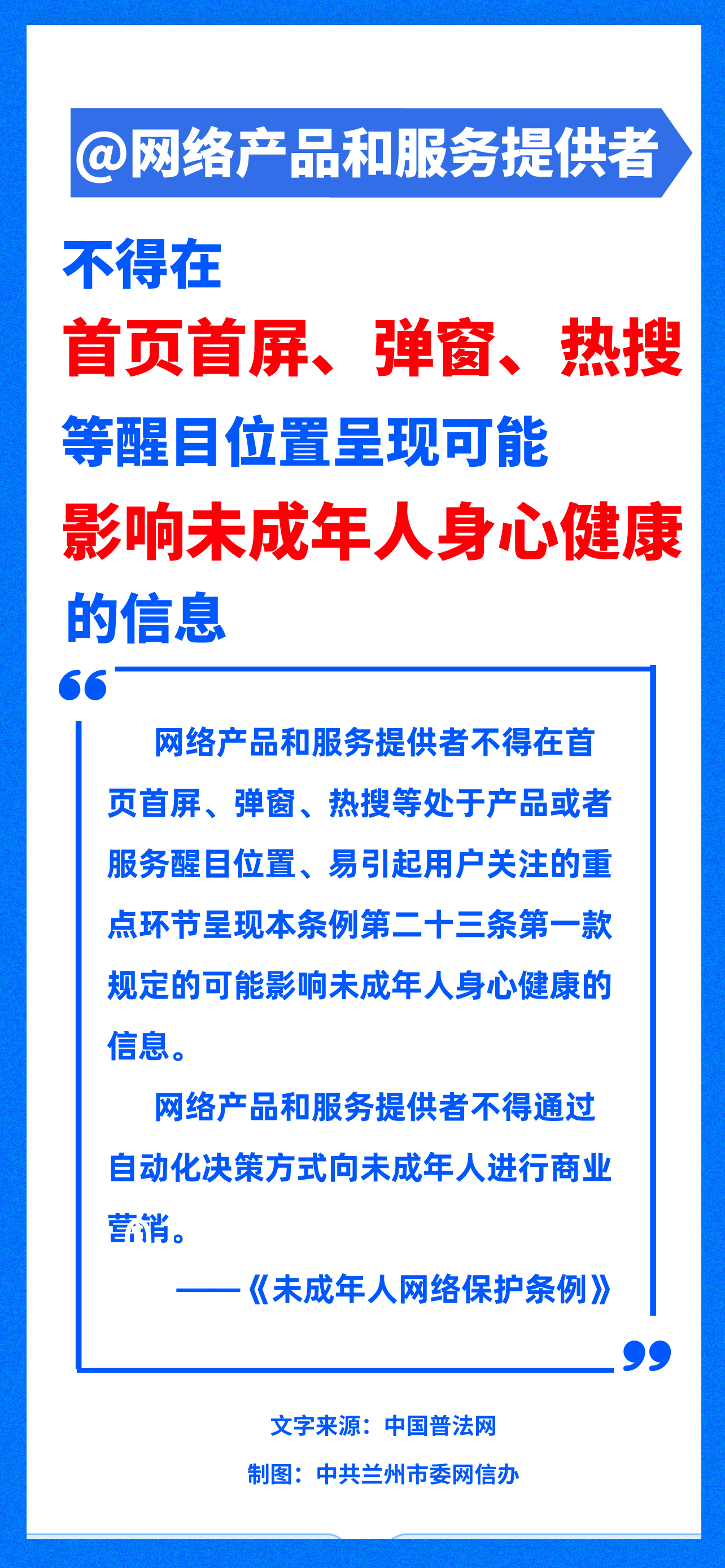 《未成年人网络保护条例》2023年10月24日发布, 将于2024年1月1日起施行。 该《条例》是我国出台的第一部专门性的未成年人网络保护综合立法, 旨在保障未成年人合法权益, 为未成年人网络保护提供有力的法治保障。 请看中共兰州市委网信办为您划重点, 速读未成年人网络保护新举措!