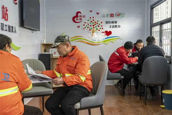 环卫工人付廷红在完成了一上午的路段清扫后,她径直地走向工会驿站内,熟练地在饮水机前接了一杯水,然后坐在椅子上慢慢地喝着。驿站里,桌椅整齐,温馨而温暖,和她一样来此休息的外卖骑手、货车司机等新就业形态劳动者和户外劳动者们有的在安静地充电,有的在使用微波炉加热自带的饭菜。