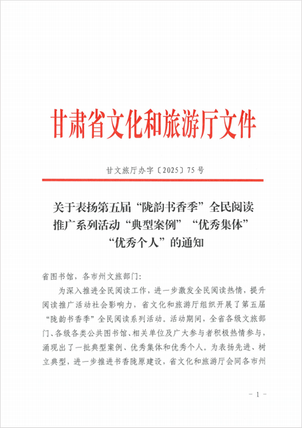 第五届“陇韵书香季”全民阅读推广系列活动由甘肃省文旅厅牵头组织,旨在深入推进全民阅读工作,激发全社会阅读热情,提升阅读推广活动的社会影响力。活动覆盖全省各级文旅部门、各类公共图书馆及相关单位,共有103个图书馆参与评选。经综合评定,最终确定15个单位为“优秀集体奖”获奖对象,榆中县图书馆凭借扎实的阅读推广成效成功入选。