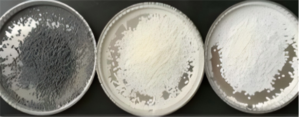 左至右分别为氢还原成品催化剂、新鲜催化剂、载体