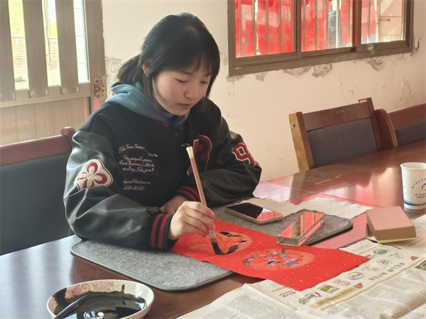 活动当天,村委会热闹非凡、年味十足。本村书法爱好者齐聚一堂、墨香四溢。铺展红纸、蘸满浓墨,凝神挥毫、笔走龙蛇,一幅幅饱含祝福的春联、一个个圆润喜庆的福字跃然纸上。内容既有“一年四季行好运,八方财宝进家门”的传统吉祥语,也有“五味调和香满室,三餐烹饪乐无穷”的温馨佳句。充分彰显了新时代乡村文明新风尚,寄托了村民对美好生活的向往与期盼。村民们一边晾晒墨迹未干的春联,一边相互欣赏、交流品鉴,精心挑选自己喜欢的春联,现场欢声笑语不断。镇、村工作人员一边发放春联、与村民拉家常,一边宣传冬季用火用电安全、防一氧化碳中毒、交通安全等知识,把平安祝福与温馨提示一同送到群众身边。