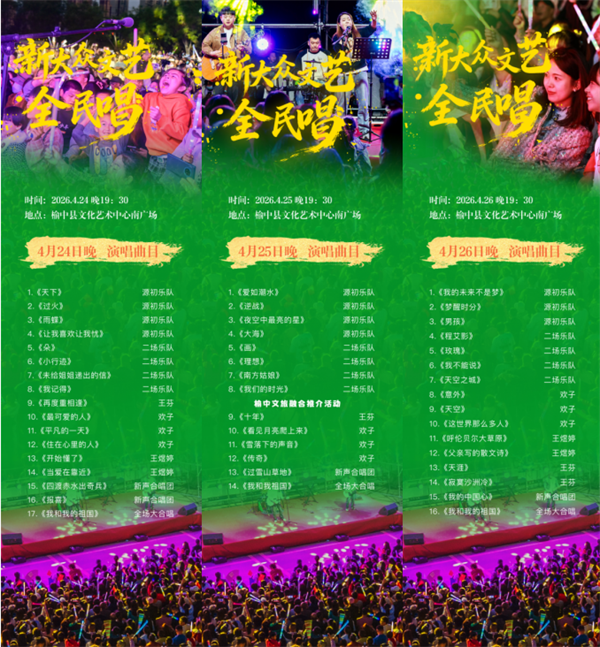 “新大众文艺・全民唱”活动将于4月24日至26日、5月3日至5日每晚19:00至21:30,在榆中县文化艺术中心南广场火热开唱。活动秉持“百姓舞台、全民参与”的宗旨,不设门槛、不限形式,普通群众均可自由登台、即兴演唱,用歌声唱响经典、抒发心声,真正实现“人人都是主角、个个都能出彩”。期间,基层文旅融合推介环节将于4月25日穿插在文艺演唱中场进行,以歌为媒、以文促旅,集中展现榆中文旅融合发展的丰硕成果与乡土文化的独特韵味。