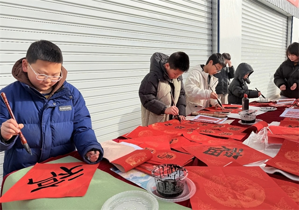 冰雪嘉年华区域是孩子们的欢乐天地。晶莹剔透的冰雪设施与童话般的雪人相映成趣,家长们带着孩子穿梭其间,堆雪人、玩冰雪滑梯、打卡冰雪景观,欢声笑语此起彼伏。一旁的民俗体验区暖意融融,10余名小朋友在书法老师的悉心指导下,手握毛笔认真书写春联与“福”字。稚嫩的笔触虽显青涩,却饱含对新年的美好期盼,写好的春联被市民争相领取,墨香与年味在空气中弥漫,让传统民俗在亲子互动中得以鲜活传承。